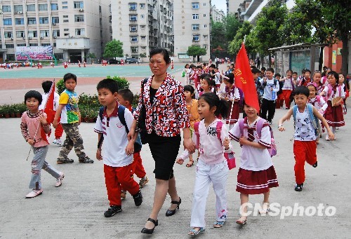 2010年5月5日,湖南省郴州市第三完全小学的孩子们在老师的护送下安全放学回家。根据湖南省教育厅要求,从当日起,该省中小学、幼儿园上课时间实行校园全封闭管理,无特殊情况,任何人不得进出校园。中新社发 贺茂峰 摄
