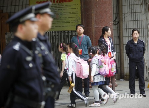 5月5日,河南洛阳校园安保全面升级,交警在此前“护学岗”保障校园门口交通的基础上,延长驻守时间;市巡警支队、派出所、社区分别对辖区学校、幼儿园安排执勤人员护送孩子上下学;学校领导带班、3名值班教师在校门口内外巡视;幼儿园严格执行接送卡制度,家长接送幼儿时持卡方可入校。图为5月5日晨上学时分,多警多岗在洛阳市实验小学门口执勤守护。中新社发 张晓理 摄