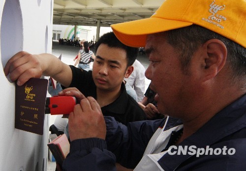 2010年5月4日,上海世博园区活跃着这样一群游客,每到一个场馆先咨询盖章事宜,再排队参观。