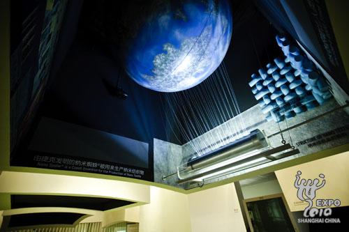 展馆内部,地面铺满苍翠起伏的草坪,空中则悬浮着20个白色中空长方体,宛如城市鳞次栉比的街区。这些长方体的横截面都是4 x 4米,里面均藏有一件捷克“文明的果实”。例如,“捷克装饰”展项将陶瓷人物,动物和茶具以别致的方式置于垂直墙面之上,表现了捷克的传统瓷器制作工艺,“纳米蜘蛛”展示了捷克发明的纳米纤维纺织设备,“捷克音乐”则给参观者带来德沃夏克、斯美塔那等捷克音乐家享誉世界的音乐杰作。