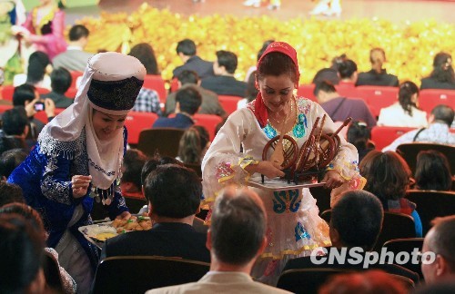 图为演出开始前,演员在观众席间穿梭,派发纪念品和少数民族传统美食。中新社发 刘新 摄