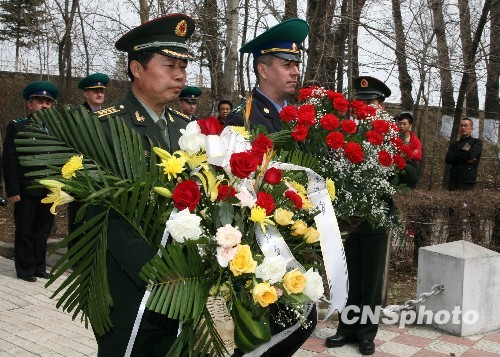 5月6日,中俄边防军人在中国黑河举行纪念卫国战争胜利65周年活动,共同缅怀在俄卫国战争和世界反法西斯战争中牺牲的先烈。 中新社发 邱齐龙 摄
