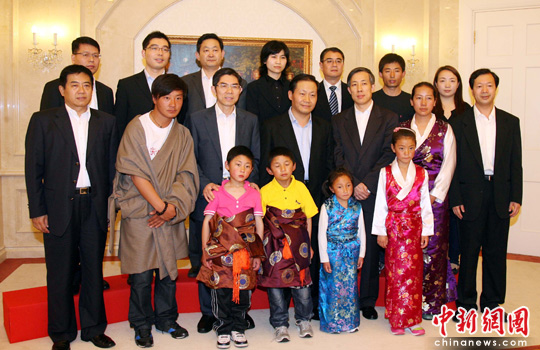 5月6日,中央政府驻港联络办主任彭清华(中)会见专程来香港参加义工黄福荣悼念活动的青海省副省长王令浚(左三)以及玉树孤儿院孤儿一行。