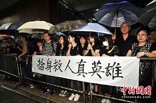 约200名市民在殡仪馆外,冒雨向黄福荣致敬。中新社发 谭达明 摄