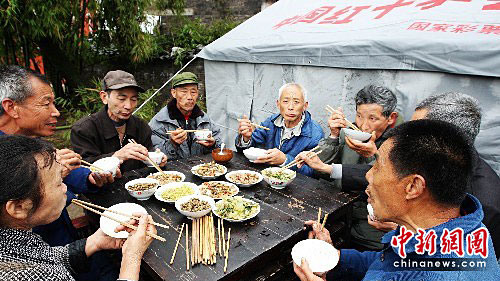 5月7日中午,此次强风雹暴雨灾害重灾区——重庆市垫江县沙坪镇李白村灾民安置点旁,灾民吃上热腾腾的饭菜。中新社发 郭晋嘉 摄