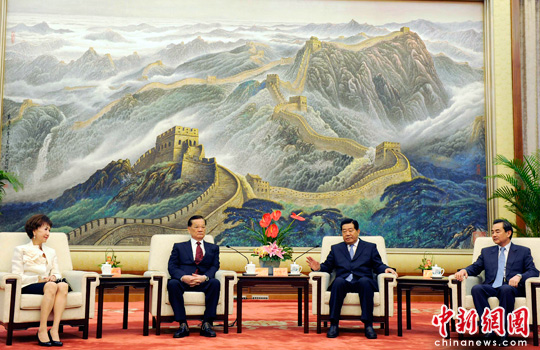 5月7日,中共中央政治局常委、全国政协主席贾庆林在北京人民大会堂会见了中国国民党荣誉主席连战和夫人一行。中新社发 刘震 摄