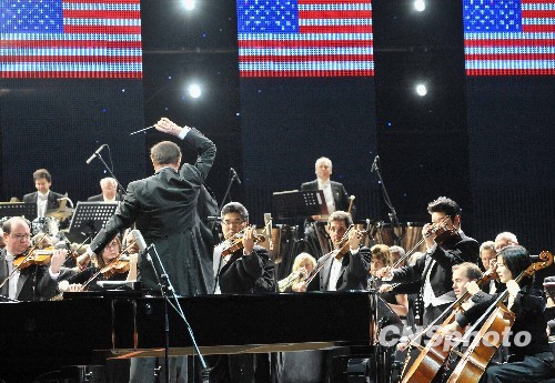 5月7日晚,美国费城交响乐团在上海世博文化中心奏响美国国歌,开始世博专场音乐会演出,这是费城交响乐团第五次访华。中新社发 贾国荣 摄