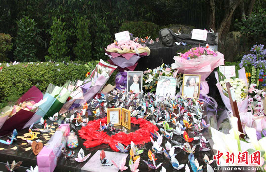 图为邓丽君墓前摆满了鲜花、相框和数不清的纸折蝴蝶。中新网记者 董会峰 摄