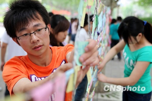 “妈妈,您辛苦了!祝您身体健康!”5月8日,安徽淮北师范大学学生们纷纷制作贺卡、编写感恩心语,将祝福卡片挂在“亲情墙”上 ,在母亲节即将到来之际遥寄赤子之情。中新社发 山丘 摄