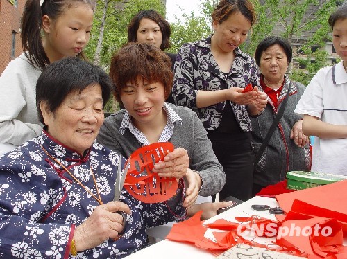 2010年5月8日,安徽淮北矿业集团矿工总医院退休职工、民间剪纸艺人王万英来到小区现场为老人和小区居民剪纸,并把剪纸技艺传授给她们,以庆祝5月9日母亲节。中新社发 孟德强 摄
