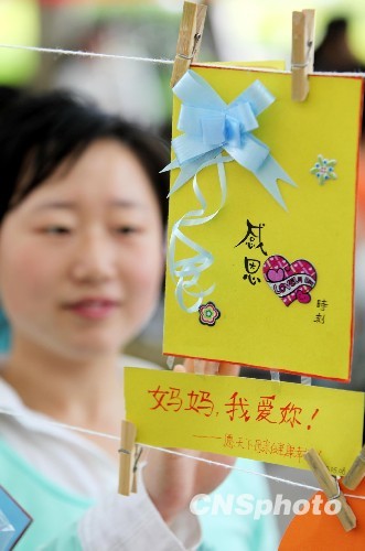 “妈妈,您辛苦了!祝您身体健康!”5月8日,安徽淮北师范大学学生们纷纷制作贺卡、编写感恩心语,将祝福卡片挂在“亲情墙”上 ,在母亲节即将到来之际遥寄赤子之情。中新社发 山丘 摄2
