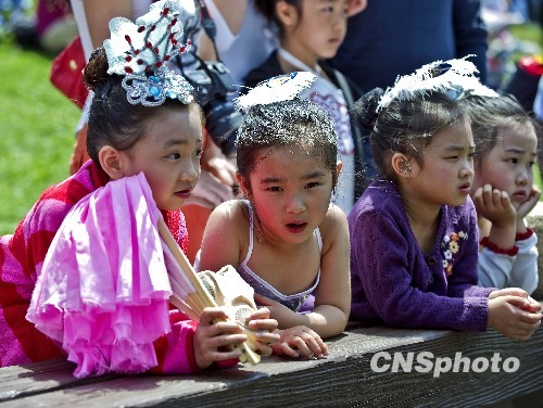 5月8日,旧金山华人华侨举行纪念母亲节游园会。精彩的节目吸引几位候场表演节目的华裔儿童的眼球。中新社发 陈钢 摄