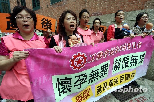 5月8日,香港工联会组织数十名在职妇女和孕妇在母亲节前夕游行请愿,促请政府修改法例,延长法定的怀孕保障期至产后6个月。中新社发 洪少葵 摄