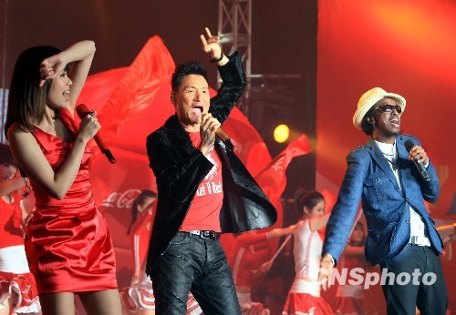 歌神张学友、海豚音天后张靓颖、非洲裔嘻哈明星K’NAAN,首次同台联袂献唱。中新社发 潘索菲 摄