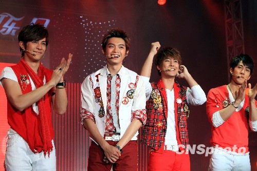 5月8日晚,飞轮海组合亮相上海世博会舞台,演唱2010上海世博会加油歌曲《快乐节拍123》。中新社发 潘索菲 摄