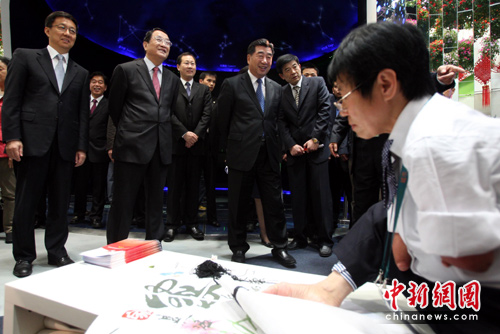 5月10日,国务院副总理回良玉在上海参观世博会残疾人馆――生命阳光馆。当日,世博会历史上首次设立的残疾人馆――“生命阳光馆”正式开门迎客。图为国务院副总理回良玉(右三)、中共上海市委书记俞正声(左二)、上海市市长韩正(左一)参观生命阳光馆。中新社发 汤彦俊 摄