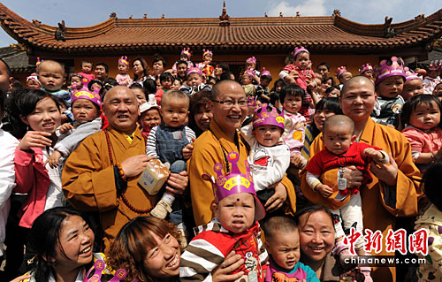 5月10日,“5·12”地震后出生在四川什邡罗汉寺的108个“地震宝宝”齐聚罗汉寺观音殿前,吹生日蜡烛,吃生日蛋糕,又一次感受到来自社会各界的无边大爱。