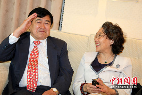 5月11日,中国国民党荣誉主席连战在台北会见“中山·黄埔·两岸情”论坛主要代表。图为会见开始前,黄埔军校政治部主任(早期)周恩来侄女、黄埔4期生周恩寿之女周秉德(右),与邓小平夫人卓琳的侄子、黄埔一期生浦承纲之子、现任香港宣威集团董事长浦江交谈甚欢。中新社发 董会峰 摄