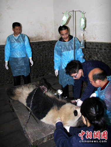 5月11日,从成都大熊猫繁育研究基地了解到,汶川地震后在北川发现的第一只野生大熊猫,目前经过专家为其紧急疗伤,生命体征已逐步趋于稳定,正在逐步恢复中。为纪念“5.12”地震两周年,应广大市民要求,这只大熊猫被取名为“北川”。这只大熊猫是4月26日上午由北川小坝乡江河村村民发现的,27日中午,被运送到成都大熊猫基地进行治疗。中新社发 张玉均 摄