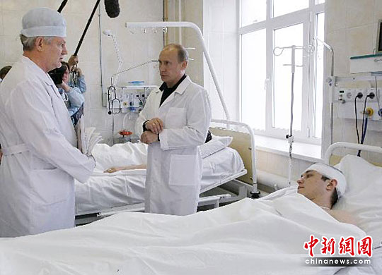 5月11日,在俄罗斯克麦罗沃州新库列茨克市,总理普京在医院看望矿难伤员。位于俄罗斯克麦罗沃州梅日杜列琴斯克市一家煤矿8日发生爆炸,截至目前已造成43人死亡,仍有47名矿工被困井下,生死不明。