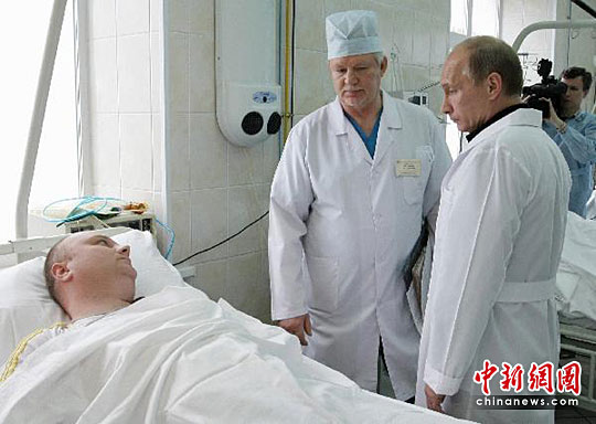 图为俄罗斯总理普京在一家医院看望矿难伤员。