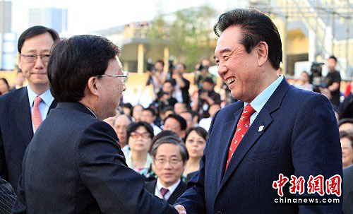 海峡两岸关系协会会长陈云林(右)与台湾文化总会会长刘兆玄夫妇等出席仪式。中新社发 潘索菲 摄