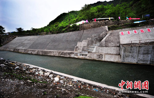 “5·12”大地震中被堰塞湖水冲垮的德阳地区绵竹最大的官宋硼水利枢纽在援建工人的奋战下,巳进入工程收尾阶段。王扬 摄