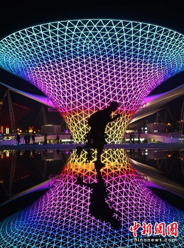 夜色将喧嚣热闹的上海世博园变得多彩浪漫,各个展馆在璀璨灯光的装扮下,宛若一座座水晶宫,加上极具异域风情的演出,吸引了众多观众。中新社发 杜洋 摄