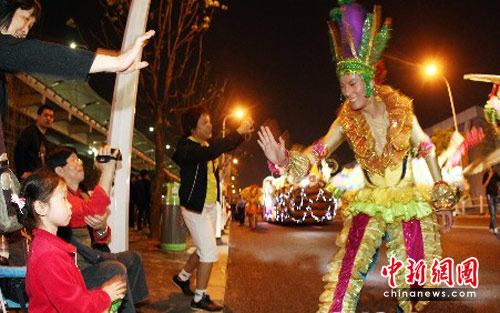 夜色将喧嚣热闹的上海世博园变得多彩浪漫,各个展馆在璀璨灯光的装扮下,宛若一座座水晶宫,加上极具异域风情的演出,吸引了众多观众。中新社发 杜洋 摄