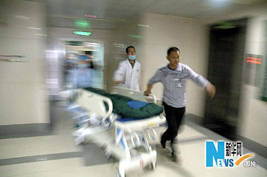 5月12日,陕西汉中3201医院的医护人员推着一名受伤儿童准备进行抢救。当日8时左右,陕西省南郑县圣水镇林场村幼儿园(民营)发生一起凶杀案。犯罪嫌疑人吴焕民持菜刀闯入该村幼儿园,致使7名儿童(5男2女)和1名教师及其母亲死亡,另有11名学生受伤,其中2名儿童伤势严重。目前案件正在进一步调查中,有关善后工作正在妥善处置中。