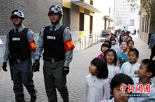 五月十二日,北京市“校园保安”队伍正式上岗仪式举行。至此,北京市正式拥有了一支专业化的中小学、幼儿园校园保安队伍。校园保安统一服装、统一标识、统一装备,以“防暴头盔、防刺背心、防割手套、小橡胶棍”四大件为基础防护装备,佩戴印有“校园保安”字样的红色臂章。