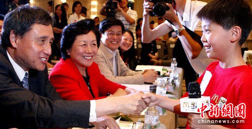 图为小球童现场拉票,与北京国安俱乐部副董事长张路亲切握手。中新社发 钱兴强 摄