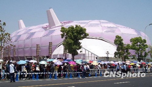 5月12日,上海世博园区参观的游客很多,参观热门展馆有时要排两三个小时的队伍。游客们没有一点抱怨,打着遮阳伞,井然有序排队观赏。中新社发 周东潮 摄