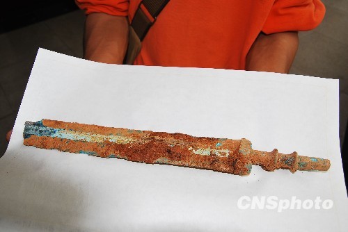湖南省郴州市文物管理处工作人员展示新发掘的青铜剑。中新社发 贺茂峰 摄