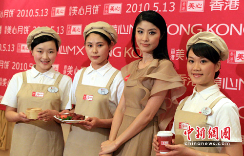 5月13日晚,香港美心集团正式亮相上海世博园区并举行开幕典礼,著名艺人陈慧琳小姐担任嘉宾,积极推广三道港人最喜爱的美食:港式奶茶、烧味和虾饺。中新社发 潘索菲 摄