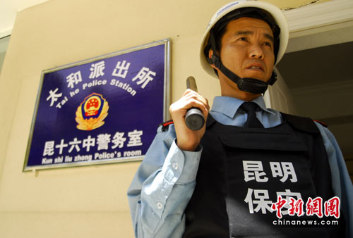 近日,云南首个校园警务室落户昆明第16中学。警务室就位于学校大门入口处右侧,外墙显眼处悬挂着警务公示栏,明确标示了法制副校长、社区民警和监督员的姓名和联系电话,法制副校长由街道办事处司法所所长担任,社区民警由派出所安排,监督员则由校方推选的学生家长代表出任。这样的人员配备更便于政府、学校及家长三方配合管理校园治安问题。图为5月14日中午正在值班的校园警务室保安。 中新社发 田洪 摄