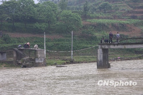群众在湖南省娄底市新化县西河镇对家村抢修洪水冲垮的毛家桥。中新社发 郭国权 摄