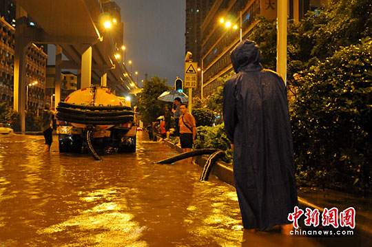 5月14日晚,雷暴雨再次袭击广州。广州城内多处出现“水浸街”现象。记者走访了多处水浸黑点,发现大部分水位已经漫过膝盖,路旁站满了要过马路对面的行人。工作人员在部分水位较深的路段拉起警戒线,疏导过往车辆。