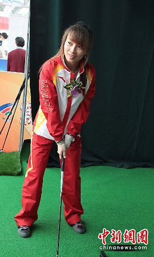 图为滑雪奥运冠军李妮娜饶有兴趣的在高尔夫模拟机前试杆。中新社发 张娅子 摄