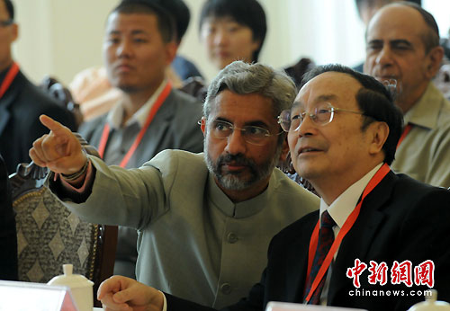 5月15日上午,中国印度友好协会会长蒋正华与印度驻华大使苏杰生在第二届中印论坛上。本届论坛主题为《从天安门到印度门:面向二十一世纪的中印问题研究》,专家学者将探讨新时期两国战略合作的可行性。