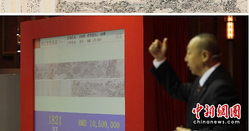 5月15日,明末画家郑重作品《江山胜览》在中国嘉德2010春季拍卖会以1176万元成交。图为拍卖现场(下)及作品(上)。(拼版图片)
