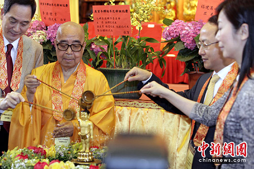 香港规模最大寺院宝莲禅寺举行一年一度的“浴佛节典礼” 拉开“浴佛节”帷幕。中新社发 张勤 摄