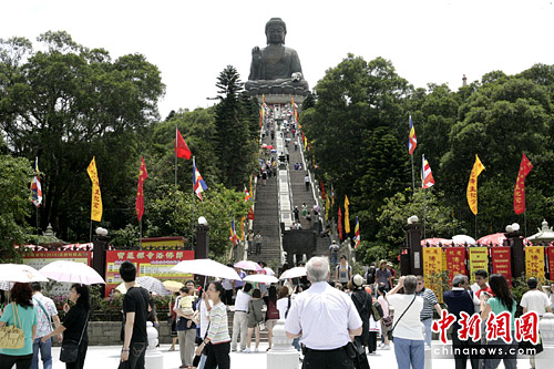 图为香港市民在宝莲禅寺户外天坛大佛前。中新社发 张勤 摄