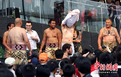 5月15日,游客在上海世博会新西兰馆前赤膊上阵学跳毛利舞。当日,上海世博会官方网站实时数据显示,截至17时30分,入园参观客流总人数已达32.21万,成为上海世博园开园以来游客人数最多的一天。