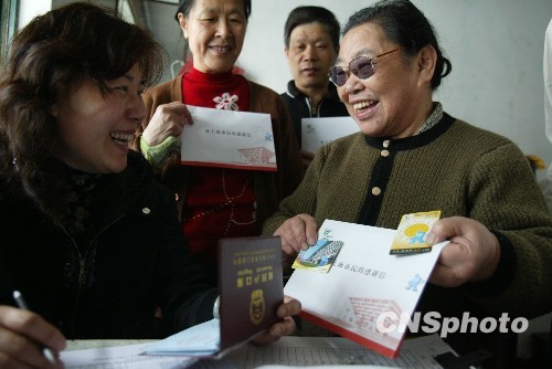 上海市黄浦区外滩街道山东北路居委会居民拿到“大礼包”后非常开。中新社发 陈焕联 摄