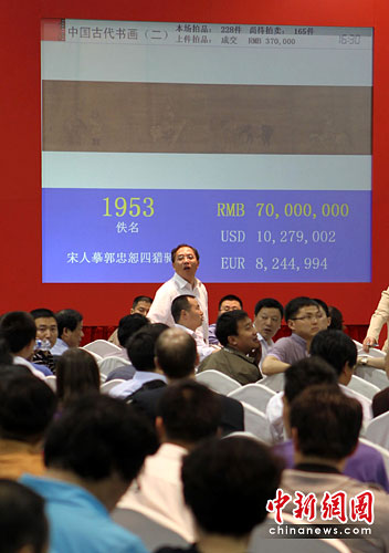 宋画《宋人摹郭忠恕四猎骑图》最终以7952万元人民币成交。中新社记者 苏丹 摄