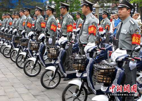 5月17日,北京东城警方校园保安电瓶车巡逻队正式成立。其主要职责是承担辖区内中小学、幼儿园上下学高峰期周边的巡逻,加大看护力量。中新社发 任海霞 摄