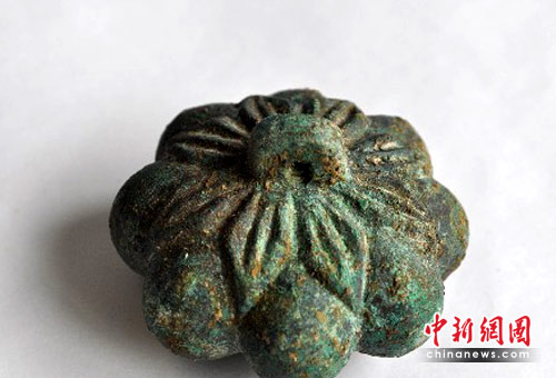 5月17日,河南省文物管理局在洛阳发布,曹操族子曹休墓在河南洛阳孟津县宋庄乡三十里铺村被发现。该墓葬虽经多次盗掘,但仍出土了许多珍贵文物。图为出土的鎏金铜带钩。中新社发 王中举 摄