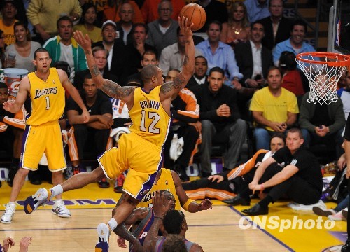 图为湖人替补布朗飞身上篮。中新社发 张炜 摄