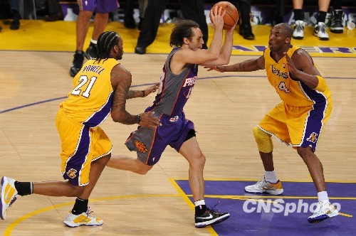 太阳队后卫史蒂夫·纳什(中)全场进帐13分、13次助攻。中新社发 张炜 摄